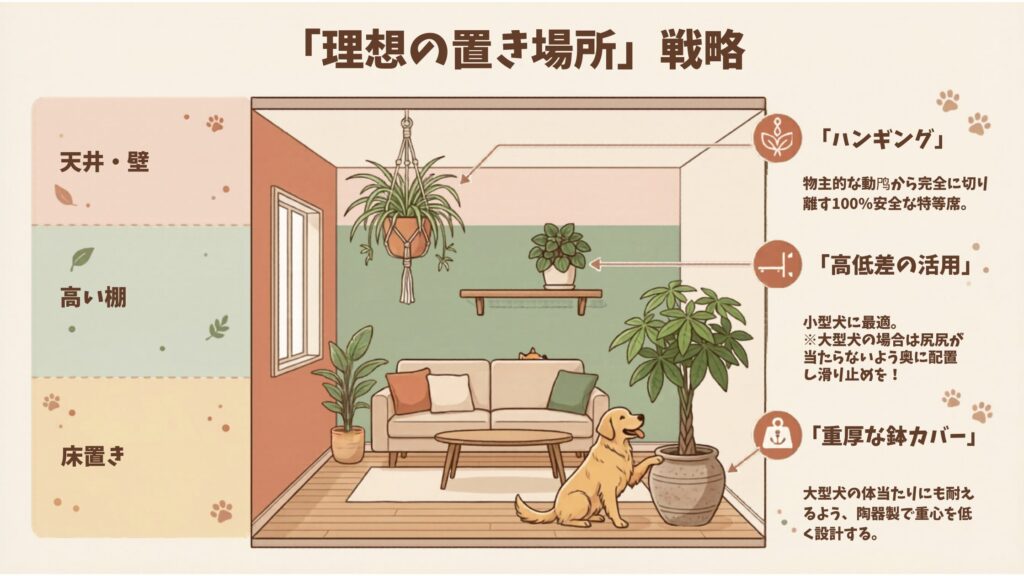子犬やジャンプ力の高い犬がいる場合、床置きは常にリスクが伴うため、天井から吊るす、あるいは壁掛けのプランターを使用してハンギングすることで、ワンちゃんの物理的な動線から完全に植物を切り離すことが可能です。