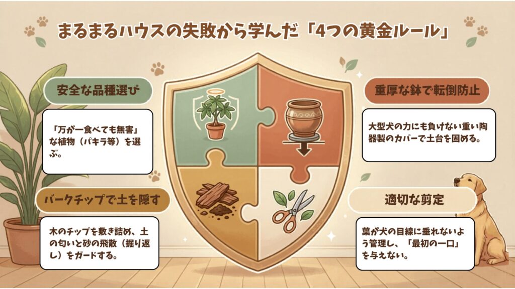 転倒防止のため安定感のある太い幹のタイプを選んでください。大型犬がいる場合は重厚な鉢カバーを使用し、転倒とつまみ食いをダブルガードすることをおすすめします。