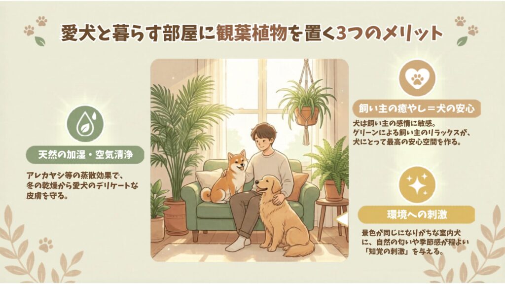 特にアレカヤシなどは加湿能力が高く、冬場の乾燥からワンちゃんのデリケートな皮膚や粘膜を守る手助けをします。