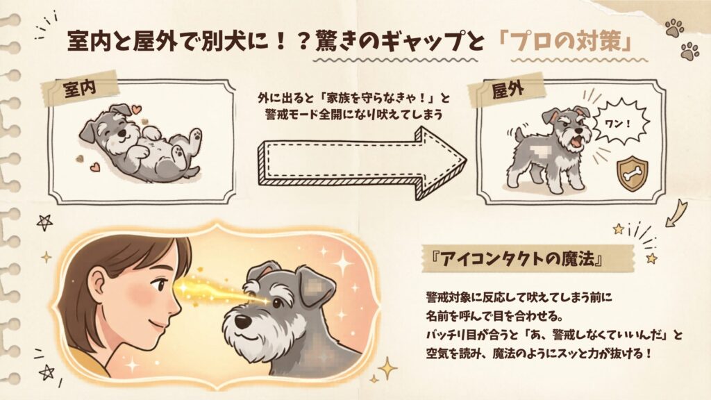 これは、外の世界(テリトリー外)で自分やパートナー(スタッフ)を守ろうとする、シュナウザーちゃんなりの強い責任感の表れです。