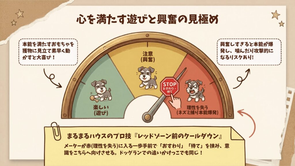 シュナウザーの心を満たしつつも、「楽しく遊んでいる状態」から「理性を失った興奮状態」へ移行する一歩手前でクールダウンさせる技術が求められます。