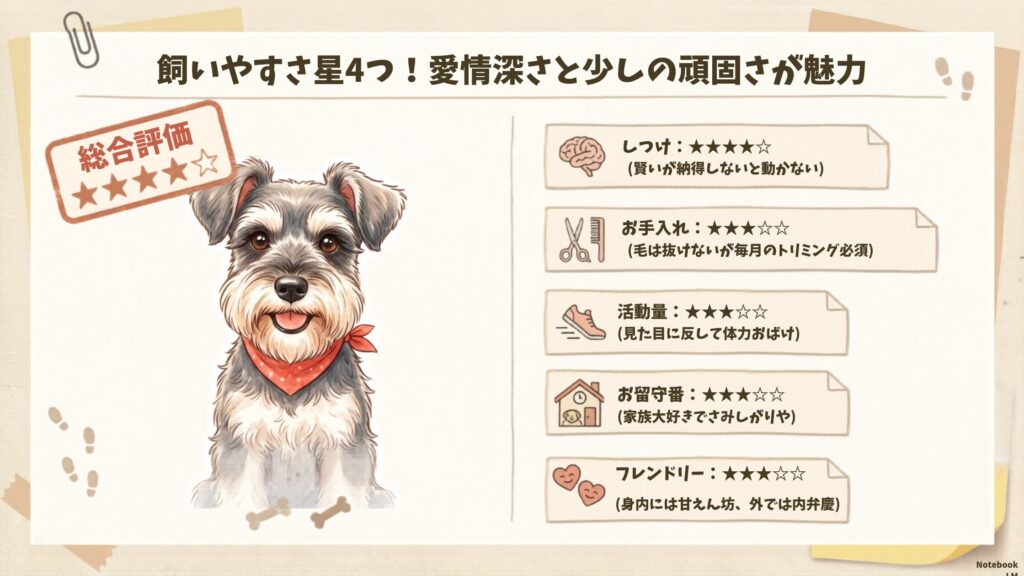 シュナウザーと暮らすことを検討している方へ、まずはペットシッターの視点から見た「飼いやすさ」を判定します。