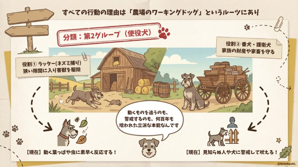 シュナウザーが見せる「動くものへの素早い反応」や「家族を守ろうとする警戒心」は、かつてヨーロッパの農場で担っていた重要な役割から引き継がれています。