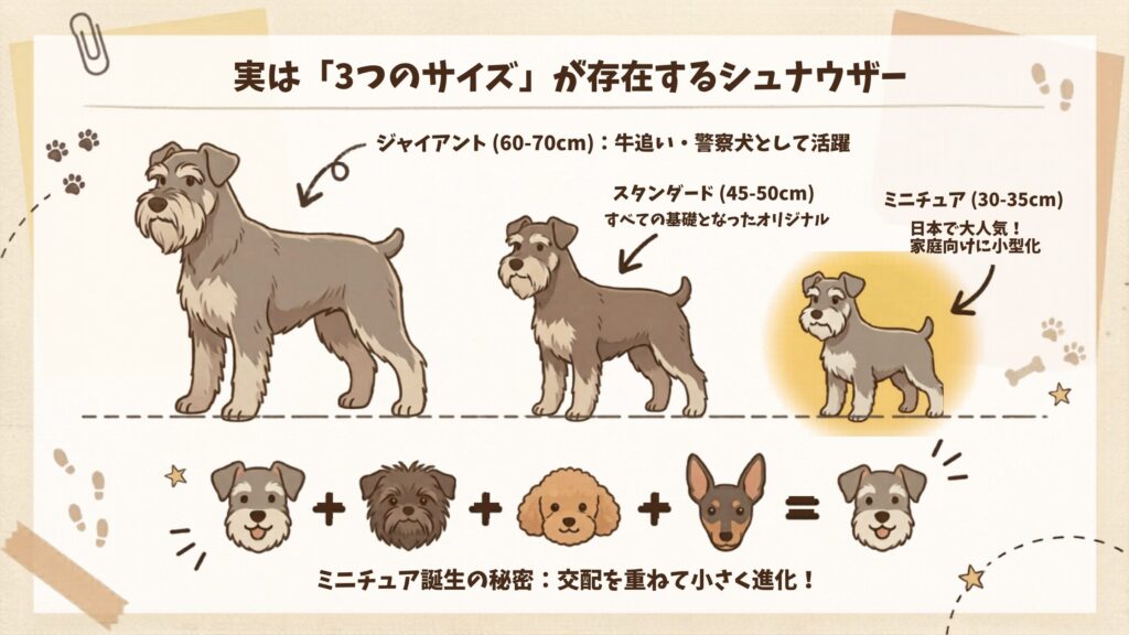 日本で家庭犬として圧倒的に人気なのは今回解説している「ミニチュア・シュナウザー」ですが、実はシュナウザーには3つのサイズ展開があり、すべて別犬種として登録されています。