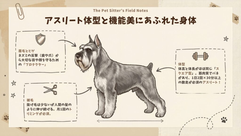 シュナウザーの体は、ただ可愛いだけでなく、かつての仕事を効率よくこなすための「機能美」に溢れています。