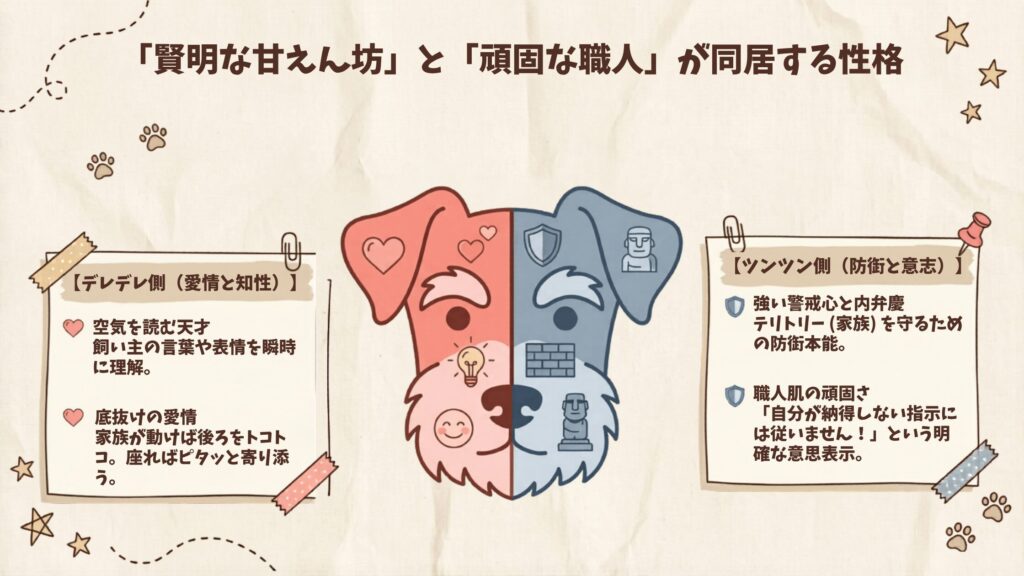 シュナウザーの性格を一言で表すなら、「賢明で家族思い、でも自分が納得しないと動かない頑固な職人さん」です。